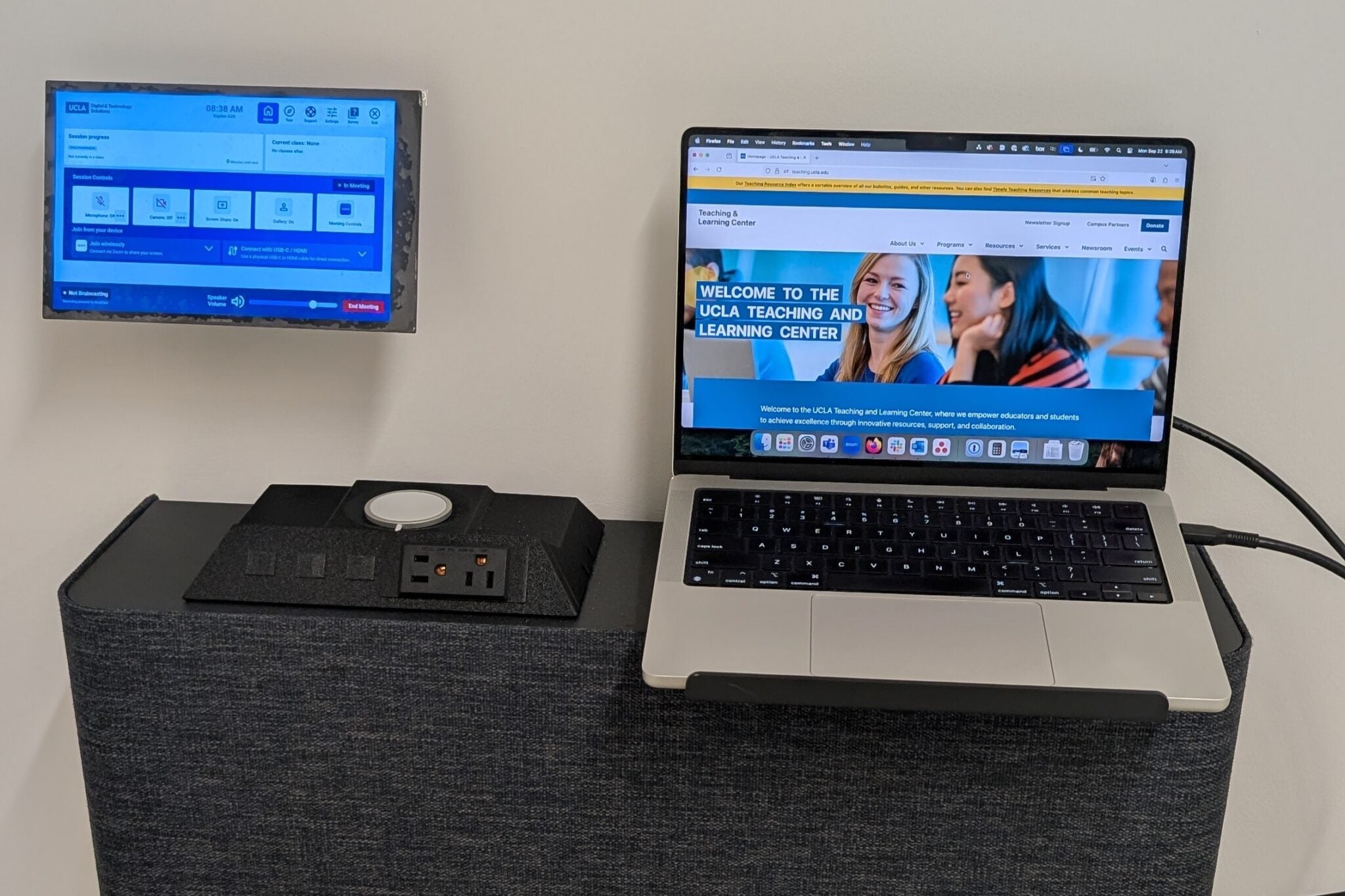 This credenza at the front of the room houses the equipment to project your device on the projectors. You can also plug in your device chargers or wirelessly charge small devices.